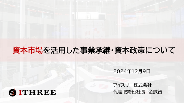 2024年12月9日に、某大手銀行本店の営業部行員向けに「資本市場を活用した事業承継・資本政策について」という内容で勉強会を開催させていただきました。