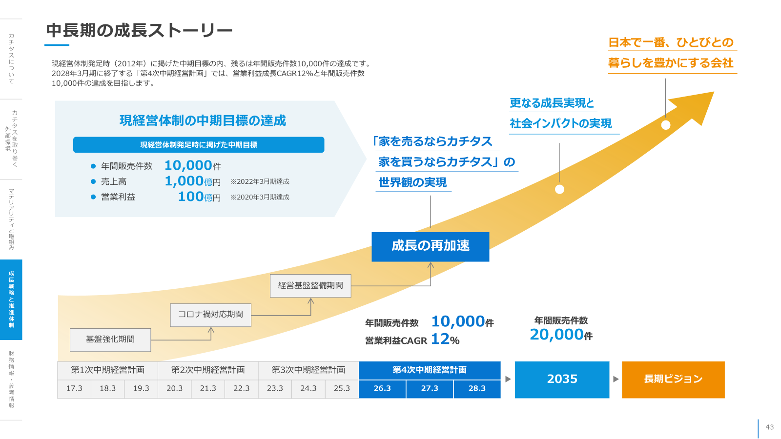 カチタスは、2025年5月に第4次中期経営計画を発表しており、その中で「日本で一番、ひとびとの暮らしを豊かにする会社」という長期ビジョンを開示しております。